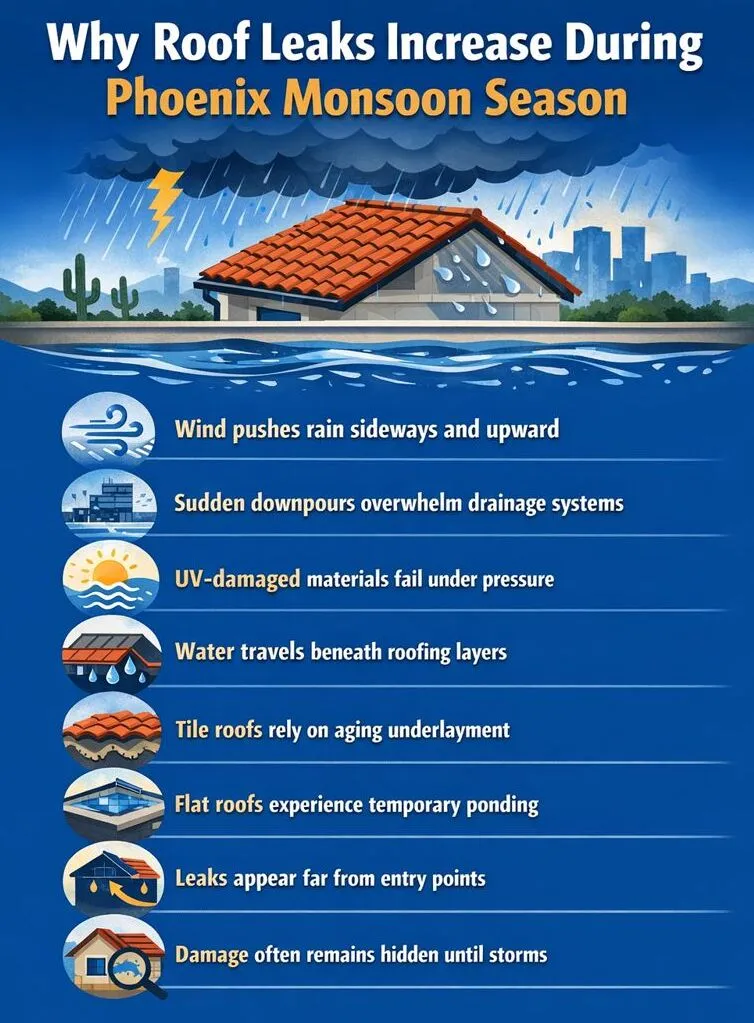 Here’s a visual breakdown of why Phoenix monsoon storms create unique roof leak risks.